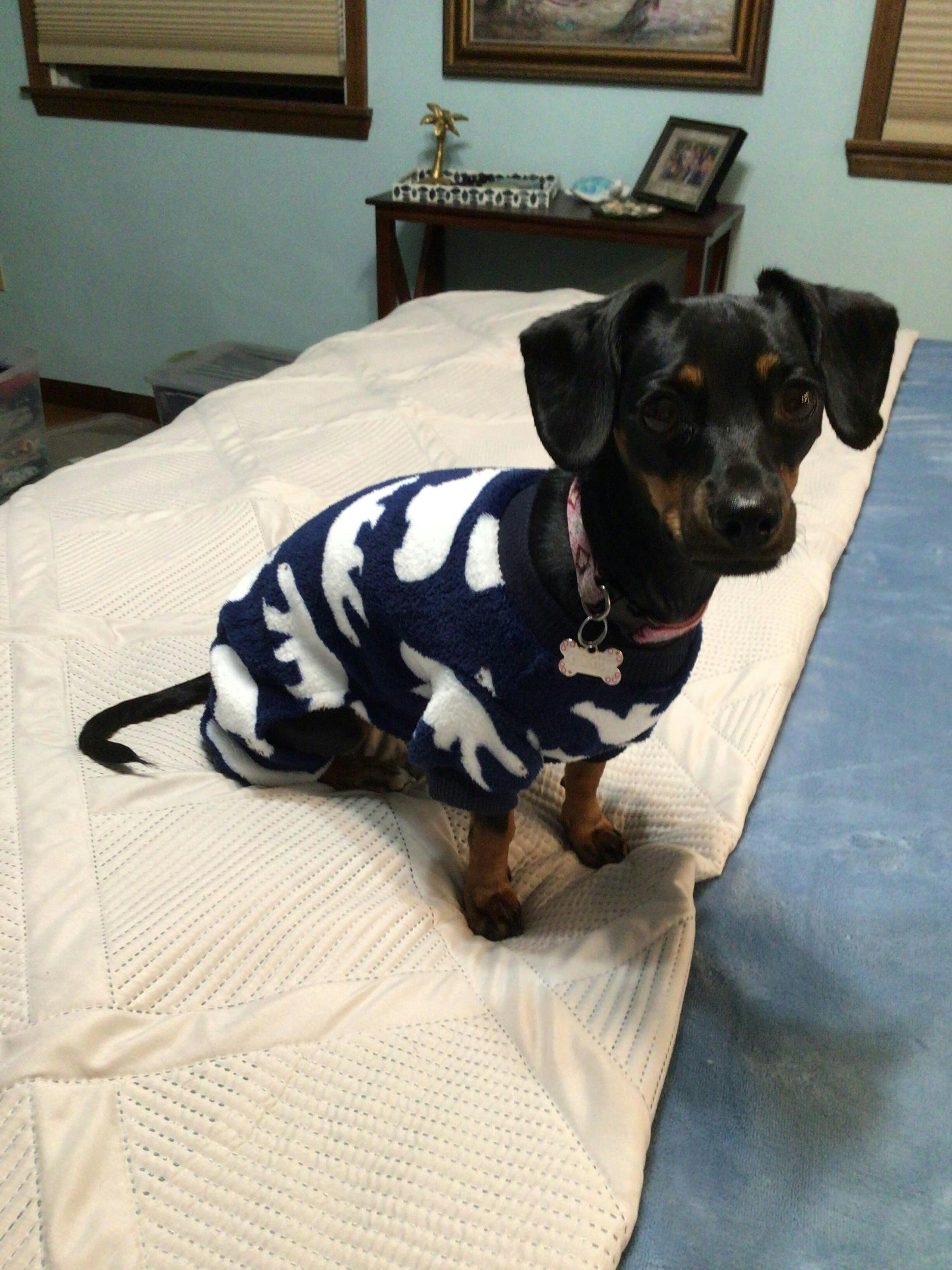 Billy LOVES his nighttime routine. We start it off with a quick trip outside, followed by a visit to the kitchen to load up his Kong with a chicken jerky treat. Then it's off to the bedroom to put on his favorite jammies, and then he races to the bed.