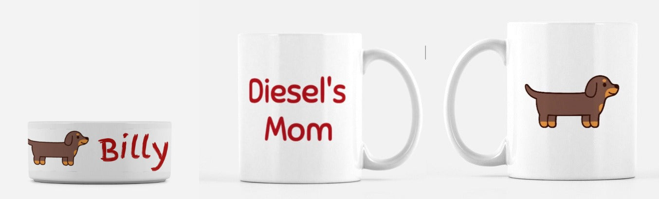 This bundle contains a Dog Bowl with your choice of dog color and your dog's name, and a matching mug for Doggy Mommy.