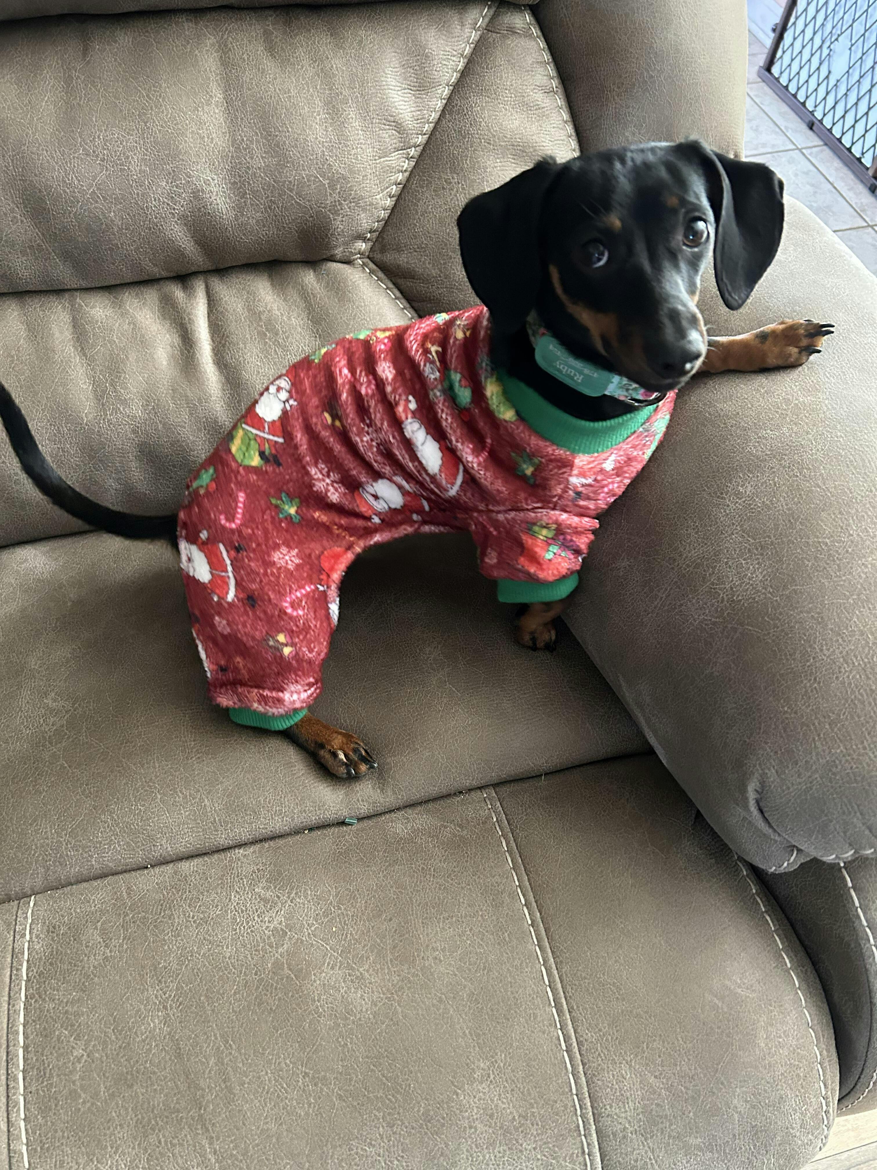 Red Santa Jams are made of soft and cozy fleece. Your pup will look adorable when he greets Santa in these jammies! Also available in green.