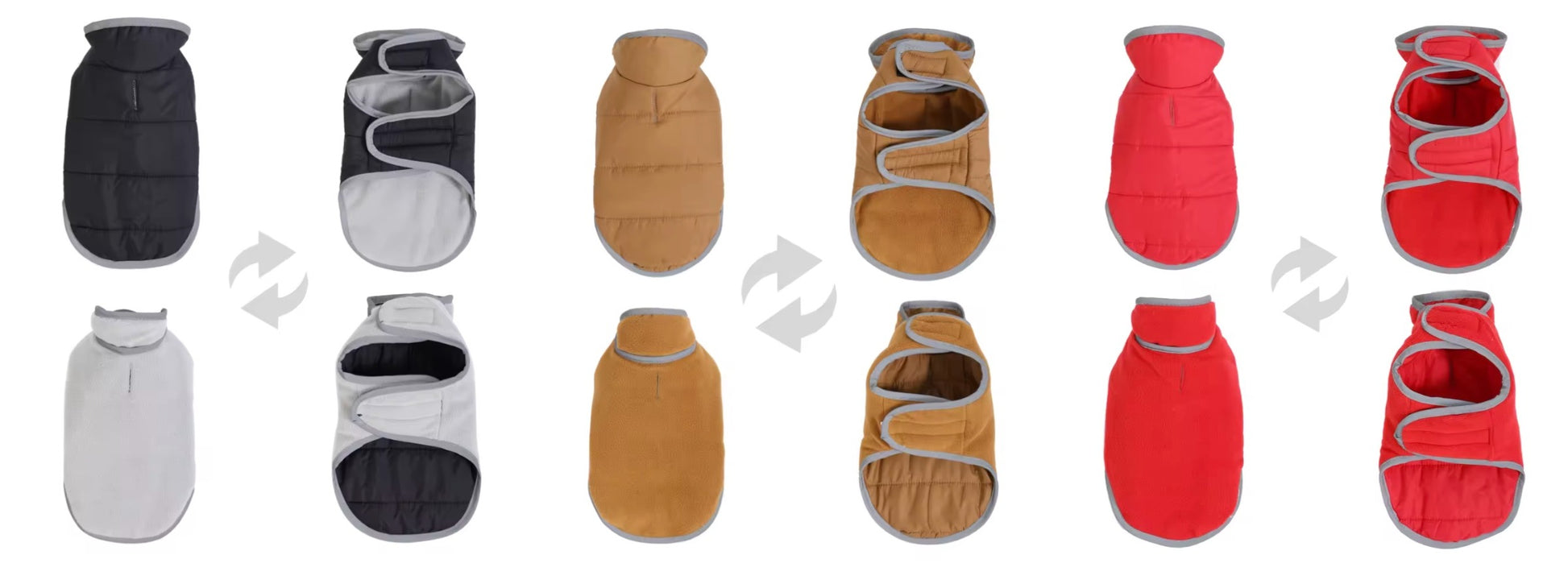 It's like two coats in one! Fleece Sherpa on one side, Puffer coat on the other. Nice! A reflective strip at the neck and tail helps your dog's visibility after dark. There's even a leash hole!